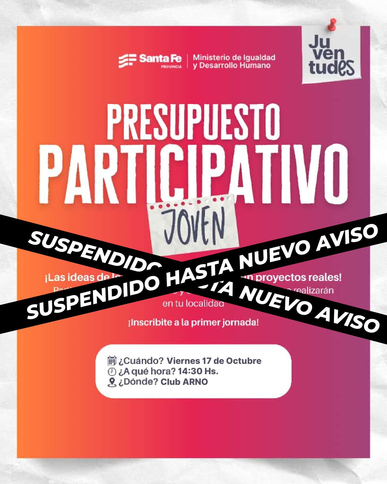 La Municipalidad de Villa Ocampo informa que la charla informativa sobre el Presupuesto Participativo Joven, prevista para este viernes 17 de octubre a las 14:30 hs en el Club ARNO, queda suspendida hasta nuevo aviso.