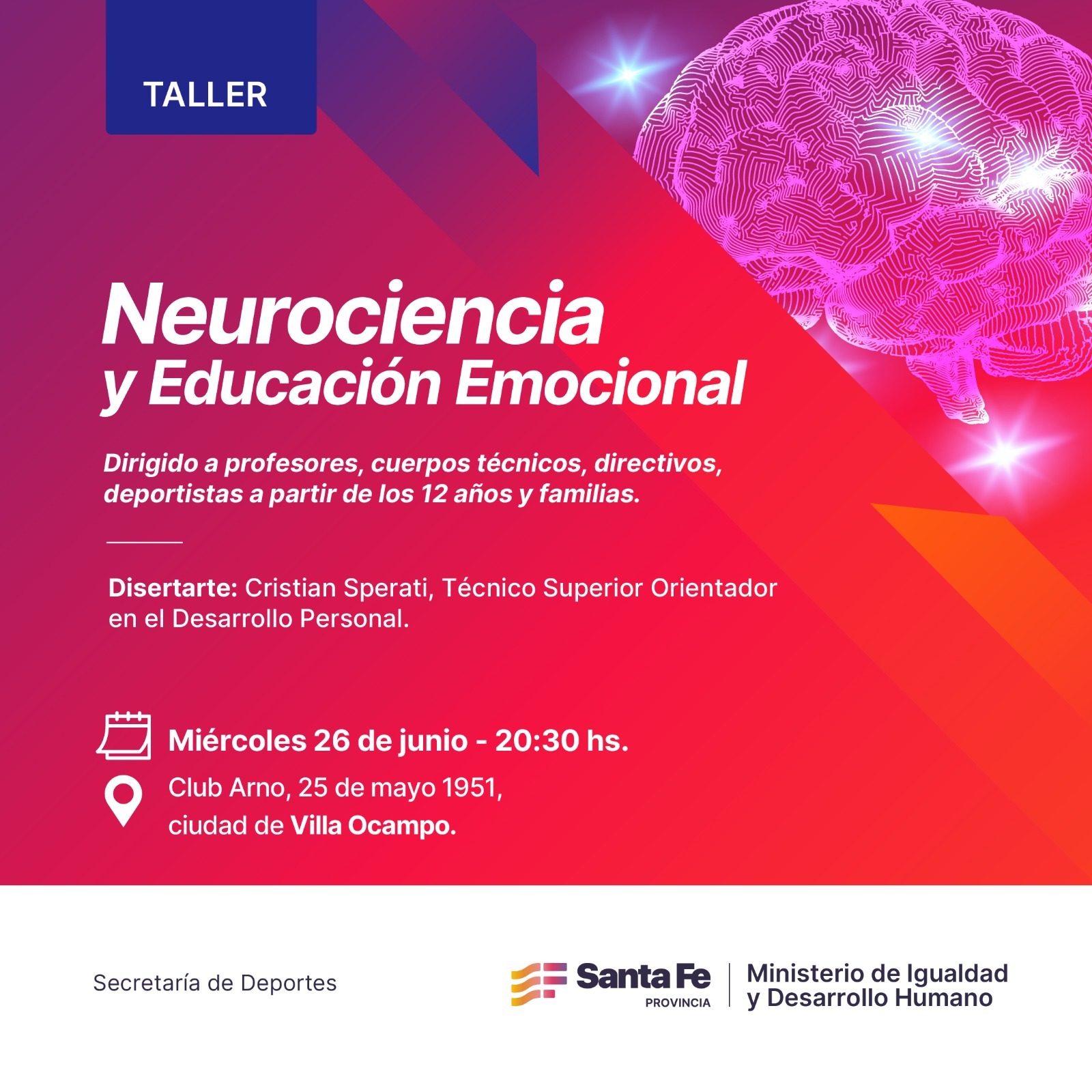 El Área de Deportes de la Municipalidad de Villa Ocampo de la Municipalidad de Villa Ocampo informa a la comunidad que desde la Secretaría de Deportes de la Provincia de Santa Fe, brindarán un taller de “Neurociencia y Educación Emocional” dirigido a profesores, cuerpos técnicos, directivos, deportistas a partir de los 12 años y familias.