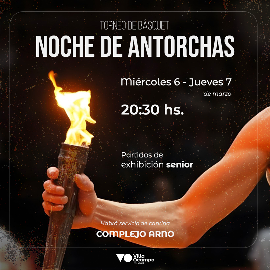 La Municipalidad de Villa Ocampo invita a la comunidad a disfrutar del Torneo de Básquet “Noche de Antorchas”, un tributo al básquet argentino para rememorar el hecho histórico de 1950, donde Argentina ganó el primer mundial de básquet. Además, este evento contará con partidos de exhibición senior, protagonizados por jugadores locales.