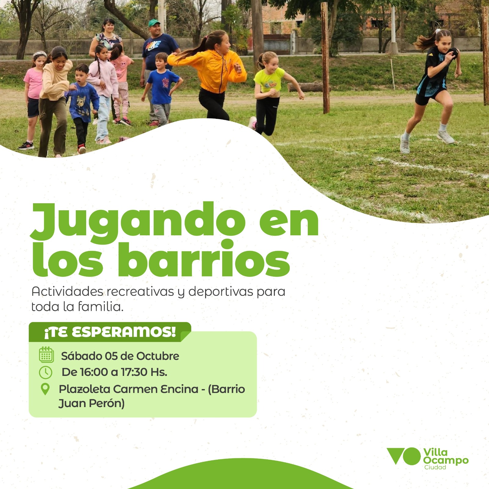 El área de Deportes de la Municipalidad de Villa Ocampo invita a vecinos del barrio Juan Perón, y aledaños; a participar de esta nueva propuesta deportiva barrial “Jugando en los Barrios”, donde se llevarán a cabo actividades deportivas y juegos por estación.