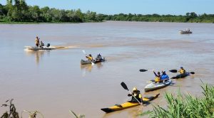 Las Áreas de Turismo y de Deportes de la Municipalidad de Villa Ocampo acompañaron a un contingente de unos 20 vecinos de la hermana ciudad de Bella Vista que realizó el cruce del Río Paraná en kayak, con apoyo logístico de lanchas, llegando al predio de las Cabañas “El Amanecer del Virá Pitá”, en la zona de Puerto Ocampo.