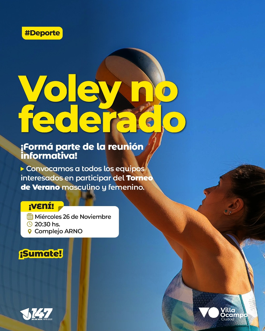 La Municipalidad de Villa Ocampo, desde el Área de Deportes, invita a todos los equipos y deportistas interesados a participar de la reunión informativa sobre el Torneo de Verano de Vóley, en sus categorías masculina y femenina.