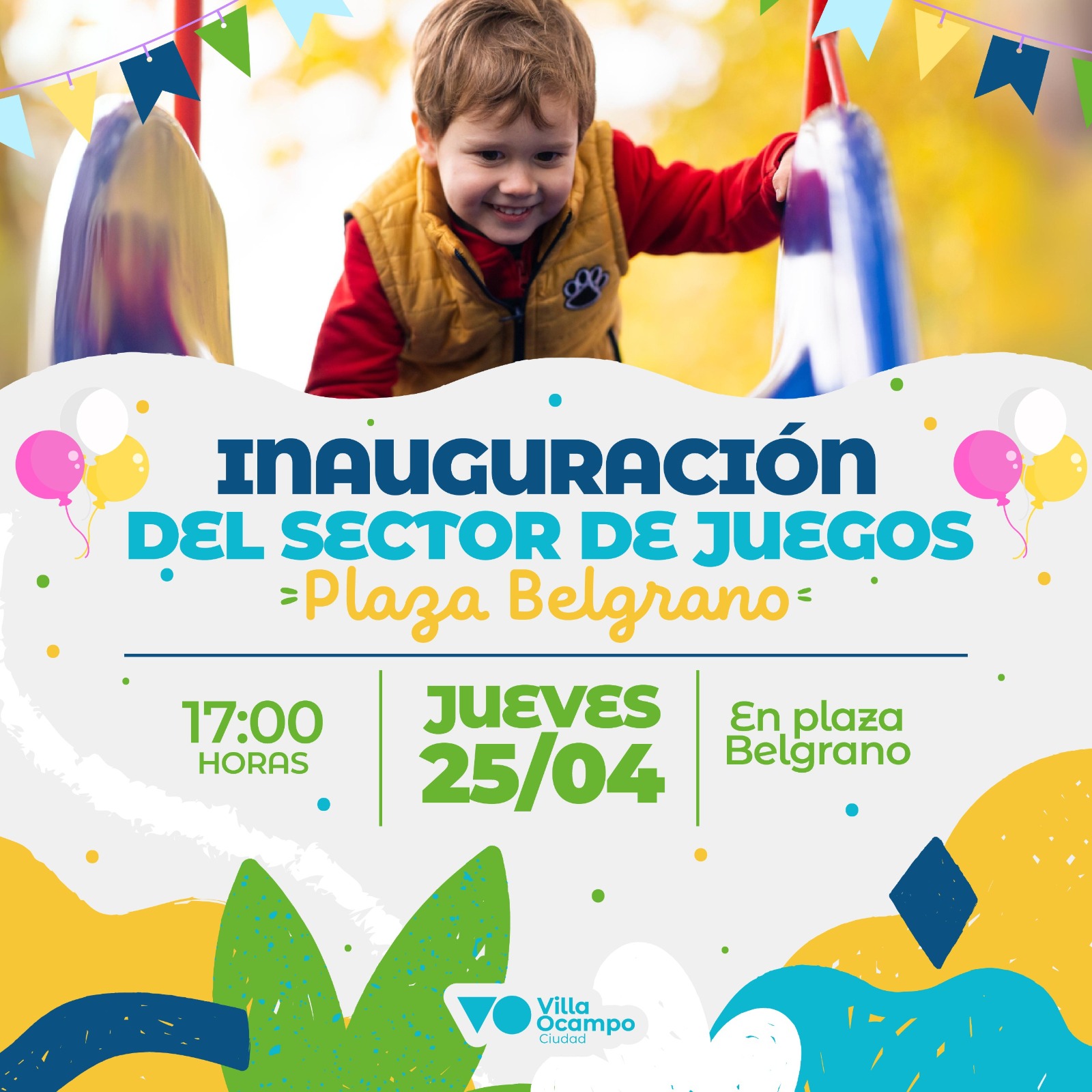El intendente de nuestra ciudad, Cristian Marega, junto a todo su equipo de trabajo invita a la comunidad, a los medios de comunicación y, especialmente, a niños y niñas a inaugurar juntos el nuevo espacio de juegos en Plaza Belgrano.
